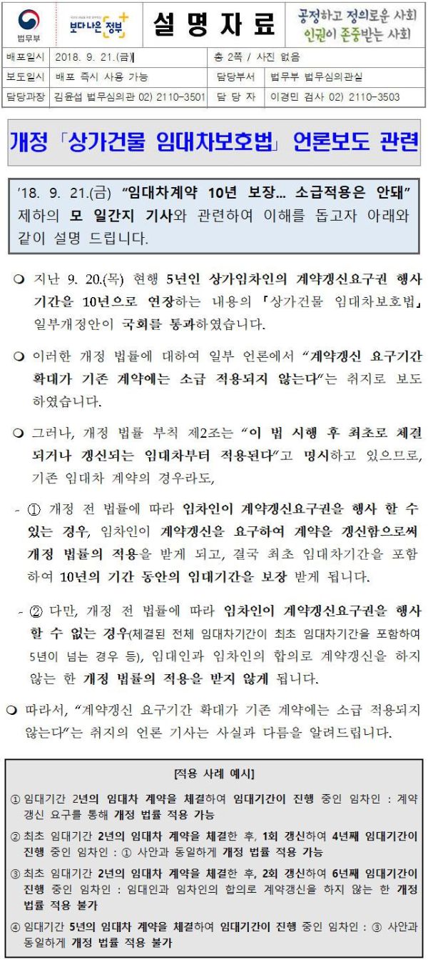 그렇다면 기존 임차인은 소급적용 받지 못하는 걸까요? 많은 임차인의 궁금증해하는 내용임에도 일부 언론이 소급적용되지 않는다는 기사가 나간 후 시장에 혼란이 야기되자 법무부에 지침을 마련하여 발표한 자료를 살펴보면 쉽게 이해할 수 있습니다.