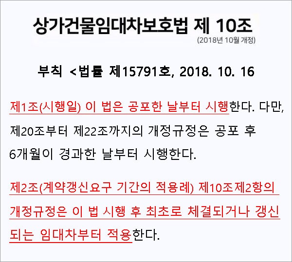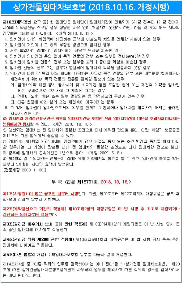 2018. 10. 16일에 상가임대차보호법 개정이 시행된지 벌써 2년째를 맞이하고 있습니다만 소급적용을 받아 최초 계약일부터 10년 임대가 가능한지 아니면 5년밖에 보장받지 못하는 건지 궁금해하는 임차인을 위해 개정된 내용과 소급적용 여부, 계약갱신요구(청구)권에 대해 정리해 보았습니다. 그동안 궁금했던 내용이 말끔히 해소되리라 확신합니다.