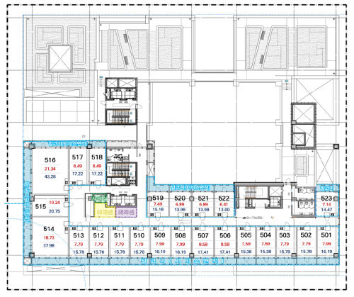 「섹션오피스」는 4층부터 12층까지로 전체 214실로 구성되었으며, 각 층별 23개 호실로 되어있습니다. 각 호실별 공급 평수는 6평형 3개 호실, 7평형 13개 호실, 8평형 4개 호실, 10평형 1개 호실, 18평형 1개 호실, 21평형 1개 호실 등입니다.