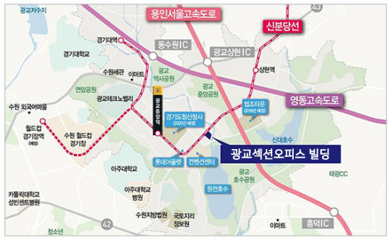 단지는 광교호수공원과 인접하면서 단지와 인접한 곳에는 수원컨벤션센터, 광교법조타운, 경기융합타운 등 행정복합 시설들이 있는 중심업무지구에 위치한 섹션오피스 빌딩입니다.