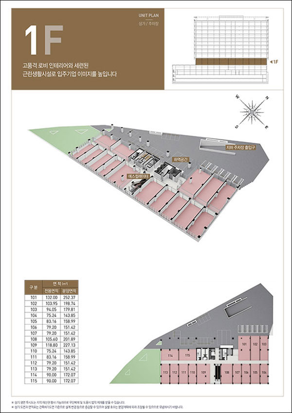 지하층과 1층은 지식산업센터 지원시설인 상가로 구성됩니다. 단지가 경사지로 되어 있어 대로변 1층이 지하층이 되고 1층이 2층으로 되어 있습니다. 층고는 대로변과 면해있는 지하 1층은 7m로 높게 구성하여 개방감 주었으며, 1층은 4.7m입니다. 상가는 총 42개 호실입니다.