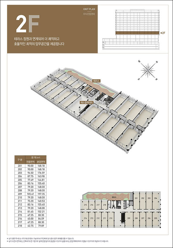 2층은 복층형(층고: 5.5m)으로 되어 있으며, 지식산업센터 18개 호실로 구성되었습니다. 북서방향 일부 호실은 야외 휴게실과 인접해 있습니다.
