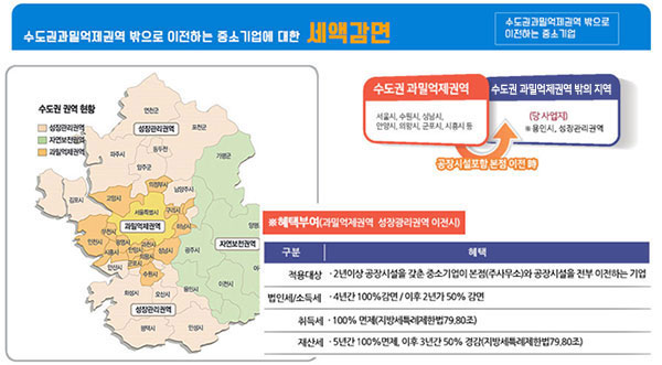 도시 집중화 현상을 막기 위해서 과밀억제권역(서울, 수도권) 밖으로 기업을 이전할 경우 '지방세특례제한법', '조세특례제한법', '수도권정비계획법'에 따라 세제혜택을 받을 수 있습니다.