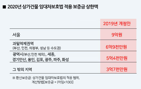 서울의 환산보증금 기준액이 현재 9억 원이며, 부산과 과밀억제권역은 6억 9000만 원, 부산을 제외한 다른 광역시는 5억 4000만 원, 그 밖에 지역은 3억 7000만 원입니다.