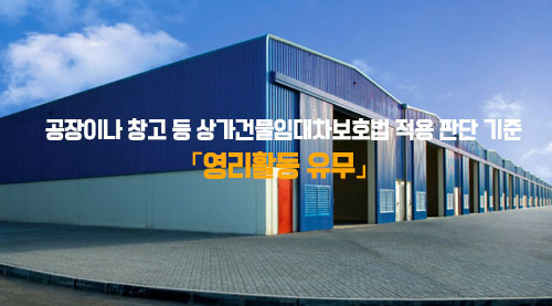 따라서 공장이나 창고 등이 상가건물임대차보호법의 적용을 받기 위하여 필요한 영리활동이 무엇이냐 하는 것은 판단하기 어려움이 많으나 대부분의 공장이 영리활동에 필요한 물건의 인도, 물품 대금의 수수 등을 공장에서 하고 있는 경우가 대부분이므로 공장도 상가건물임대차보호법의 적용을 받는 경우도 많습니다.
