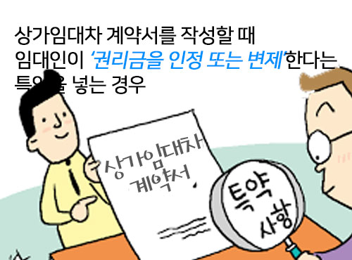 일반적으로 시장에서 거래되는 권리금은 3가지 모두를 포함하는 경우가 대부분이지만, 권리금은 법률적으로 확실하게 정해놓은 것이 없어 거래 당사자들끼리 흥정으로 금액을 결정하게 됩니다. 이렇다 보니 상가건물 임대차 계약에서 가장 많이 발생되는 분쟁이 임대인과 임차인 간의 권리금 문제인데요. 최근에는 이와 같은 권리금 분쟁을 막기 위해 '상가임대차 계약서를 작성할 때 임대인이 권리금을 인정 또는 변제한다는 특약을 넣는 경우'가 있습니다.