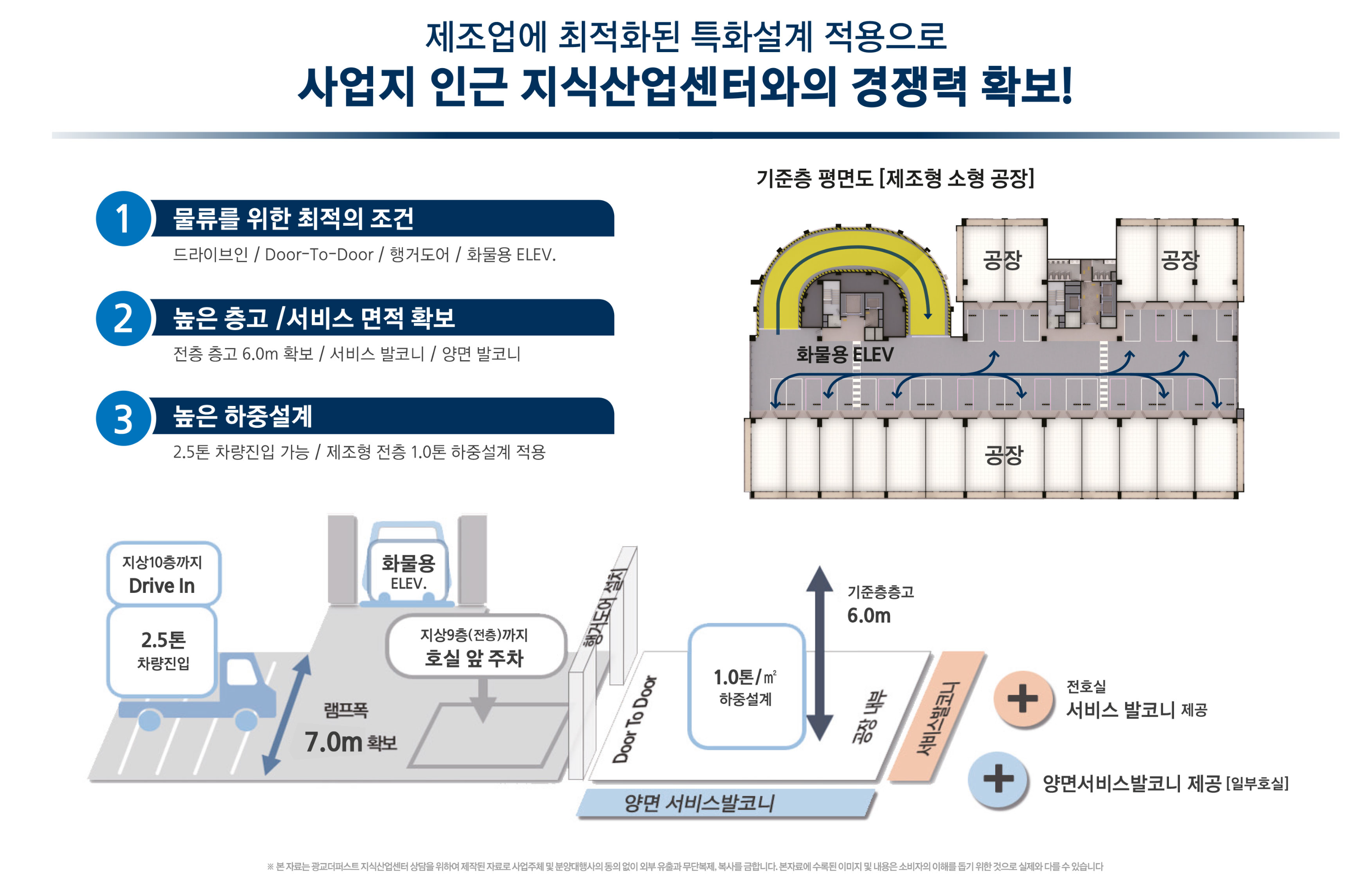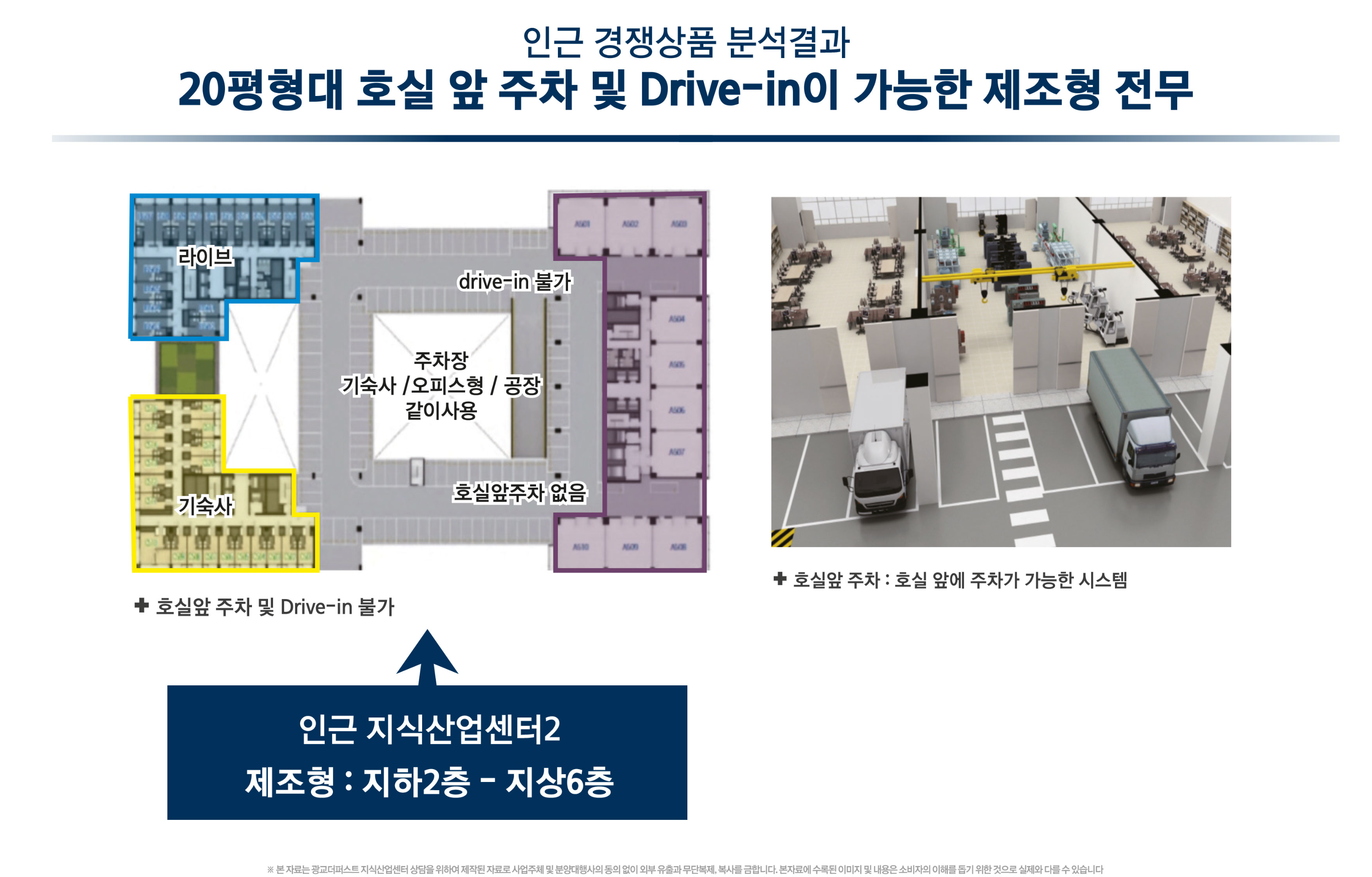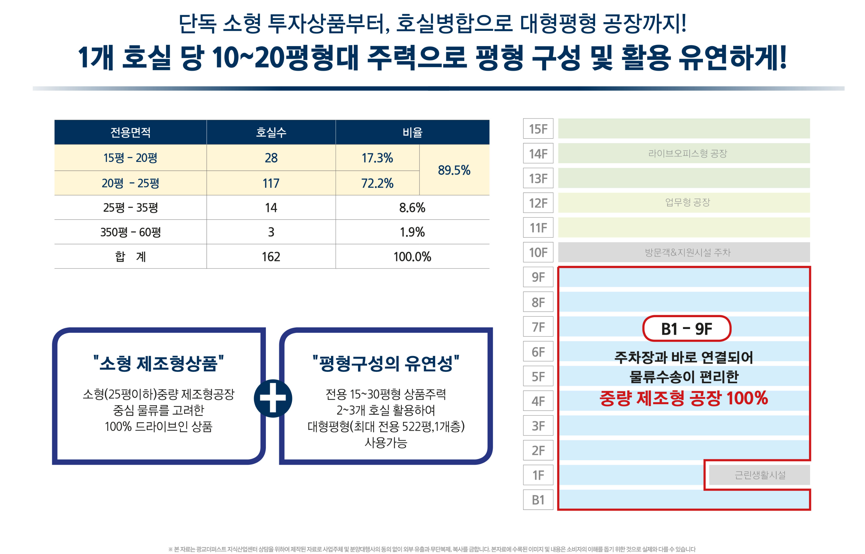 지하 1층부터 지상 9층까지는 공장형(제조 및 물류), 지상 1층에 근린생활시설(상가), 지상 10층에 공용주차장, 지상 11층~12층까지 업무형 사무실, 지상 13층~15층까지 라이브오피스로 구성되었습니다.