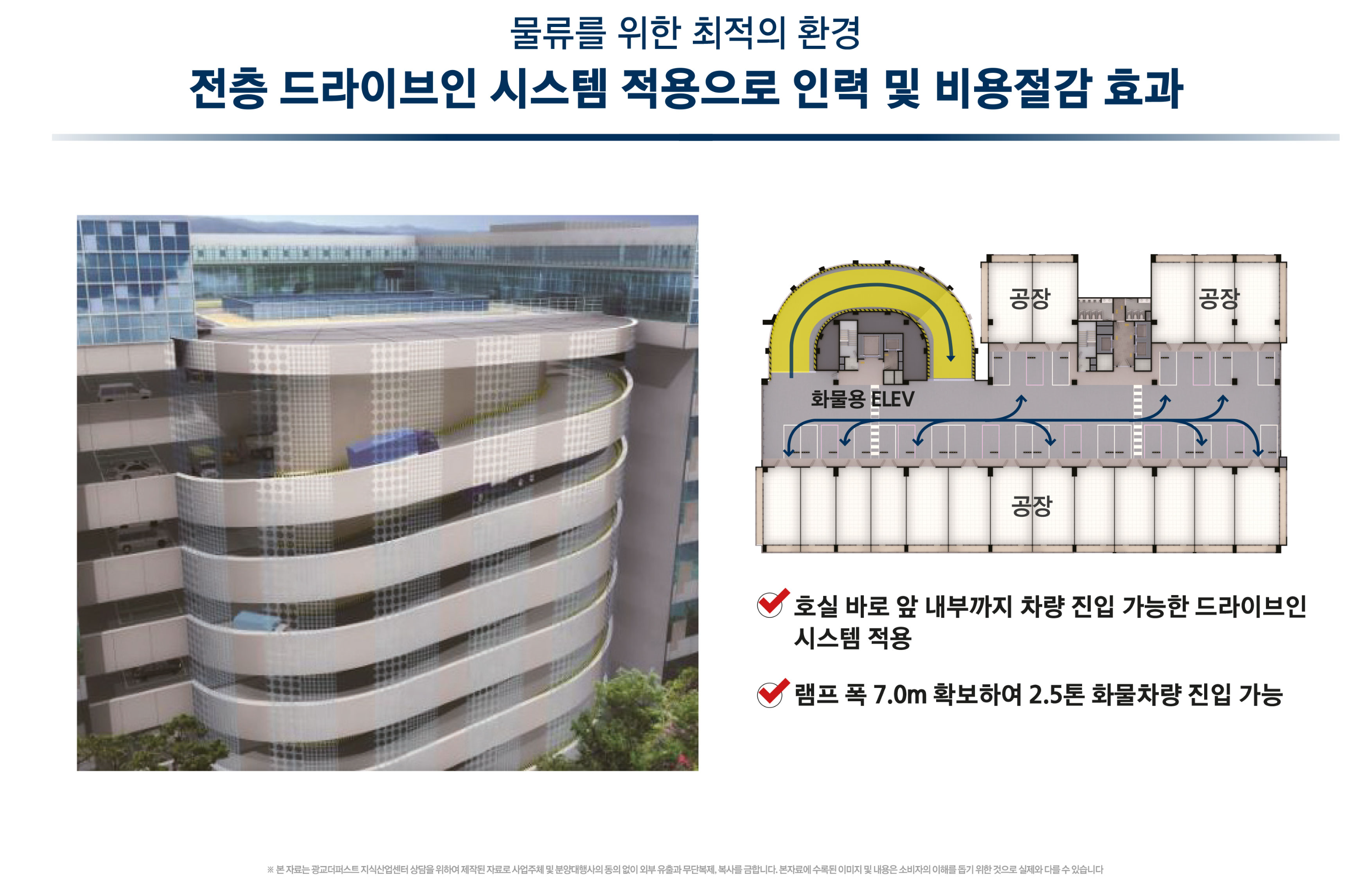 광교 더퍼스트는 지하 1층부터 지상 15층까지 1개동 총 300실로 구성된 지식산업센터입니다. 단지의 가장 큰 특징은 제조형 공장, 물류기업 등을 고려해 전층에 차량이 접근할 수 있도록 드라이브인 시스템과 화물용 엘리베이터 설치, 높은 층고와 적재 하중 등 맞춤형 특화설계가 적용되었습니다.