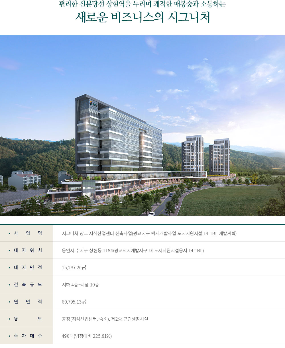 광교신도시 역세권(상현역)에 공급한 시그니처광교 지식산업센터가 "2023년 3월 중순" 입주를 시작합니다. 단지는 대지면적 1만5,237.20㎡ 부지에 지하 4층~지상 10층, 연면적 6만795.13㎡ 규모로 공급되었으며, 지식산업센터 1개동, 기숙사 2개동, 근린생활시설 등으로 구성되었습니다.