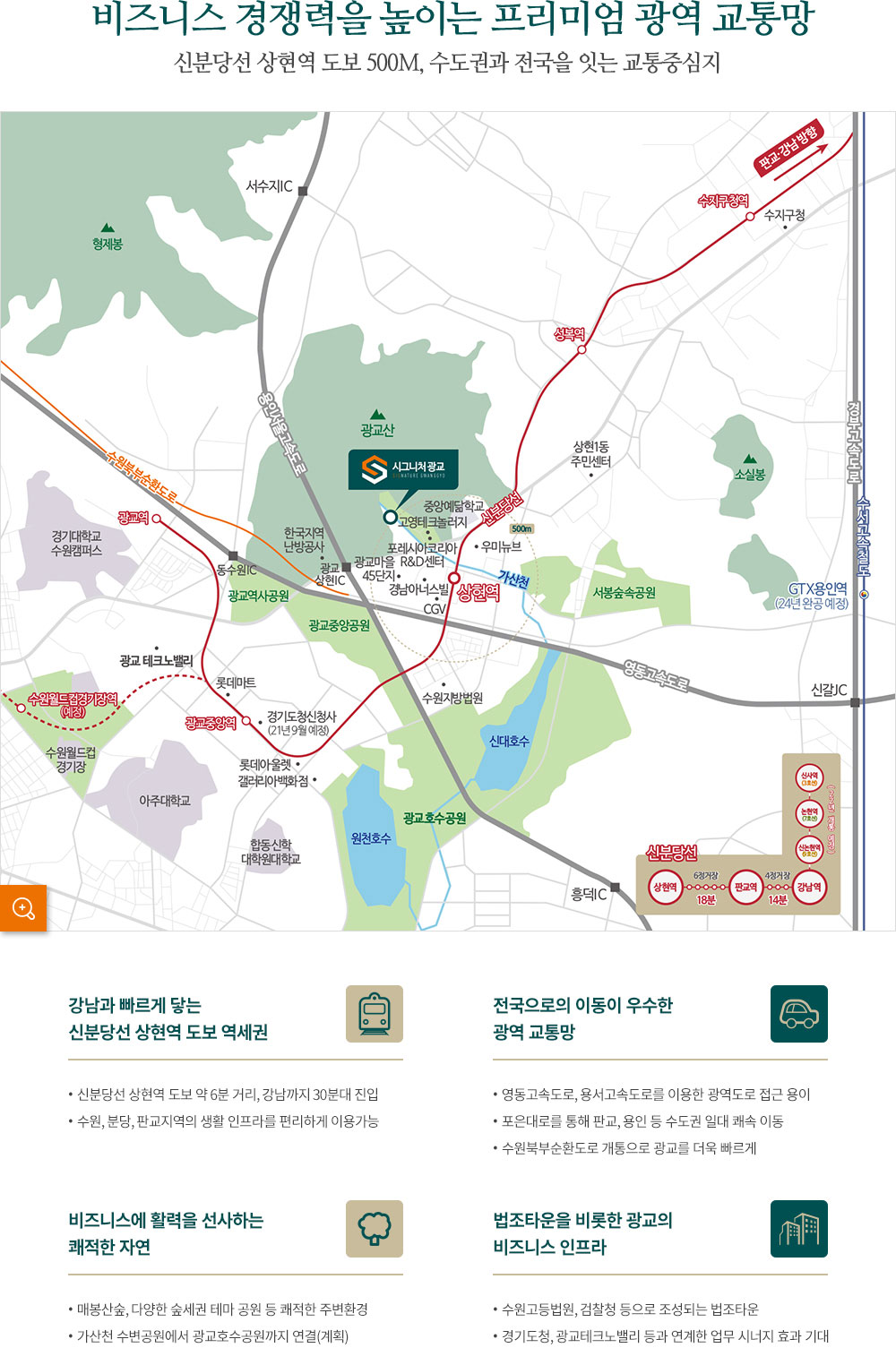 입지는 경기도 용인시 수지구 상현동 광교신도시 내에 위치해 있으며, 신분당선 상현역과 도보 10분 거리에 있습니다. 수원과 용인을 연결하는 포은대로에 접해 있어 단지 접근성이 매우 뛰어나며, 무엇보다 광교 신도시 내에 포함되어 기업하기 좋은 입지여건을 갖추고 있다는 평가를 받는 지식산업센터입니다.